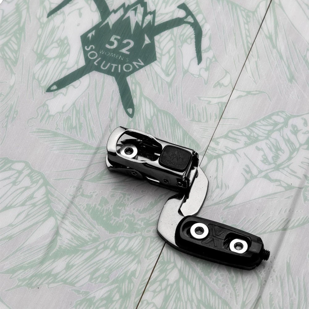Das Solution Split für Damen hat eine traditionelle Vorspannung unter den Füßen und geht in Rocker Tips über. Dank seines Hybrid-Camberprofils ist das Solution ein perfektes Splitboard mit griffiger Kante und mühelosen Float im Powder.