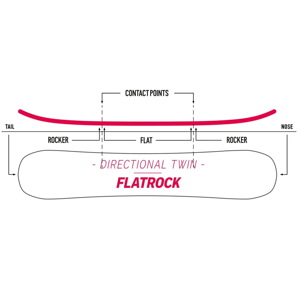 - Profil: Freestyle Camrock Camber – flach aufliegende Boardmitte, Rocker Tips
